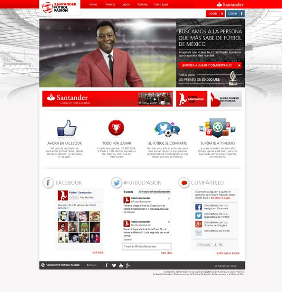 Giao diện website Santander Fulbol Pasion Thứ hai, marketing qua email và social media cũng được tận dụng để giao lưu trực tiếp, giúp khán giả cập nhật tình hình cuộc thi. 000 người tham gia và 4 triệu lượt truy cập website chỉ với ngân sách eo hẹp. Mọi hoạt động diễn ra đều phải nhằm vào các fan bóng đá tại Mỹ Latinh.